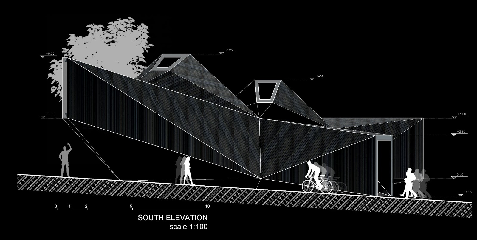 The relationship of the visitors’ centre with the SNFCC construction site is the basic guiding design element